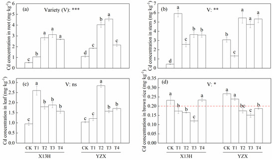 Effects of different treatments on the Cd concentration of different organs, (a–d) represent the Cd concentration in root, stem, leaf, and brown rice, respectively. The red dotted line is the Chinese food safety standard. Values are means ± standard error (SE). Different letters indicate significant differences between treatments (p < 0.05). *, **, *** represent significant differences at the 0.05, 0.01, and 0.001 levels, respectively, and ns represents no significant differences at the 0.05 level.