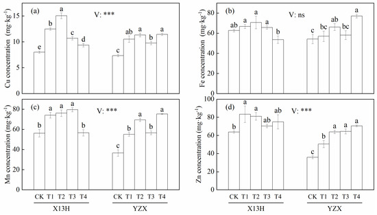Effects of different treatments on mineral element concentrations in brown rice, (a–d) represent the Cu, Fe, Mn, and Zn concentrations in brown rice, respectively. Values are means ± standard error (SE). Different letters indicate significant differences between treatments (p < 0.05). *** represents significant differences at the 0.001 level and ns represents no significant differences at the 0.05 level.