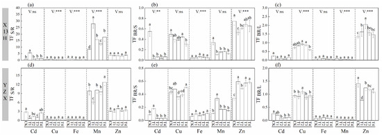 Effects of different treatments on the element transfer coefficient of rice organs, (a–c) represent TF S/R, TF BR/S, and TF BR/L of X13H, (d–f) represent TF S/R, TF BR/S, and TF BR/L of YZX, respectively. Values are means ± standard error (SE). Different letters indicate significant differences between treatments (p < 0.05). **, *** represent significant differences at the 0.01 and 0.001 levels, respectively, and ns represents no significant differences at the 0.05 level.