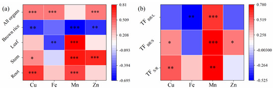 Correlation heat map, (a,b) represent the correlation between the mineral element concentrations and Cd concentration in rice organs and the correlation coefficient between the mineral element transfer coefficient and the Cd transfer coefficient, respectively. Blue and red represent negative and positive correlations, respectively, with darker colors representing higher correlations. *, **, *** means significant at the 0.05, 0.01, and 0.001 level, respectively.