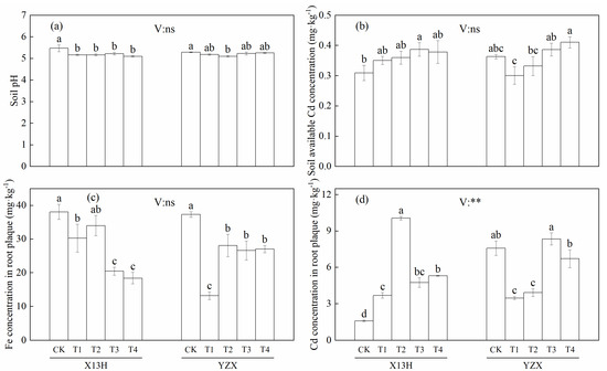 Effects of different treatments on soil pH (a), available Cd concentration (b), and the concentration of Fe (c) and Cd (d) in the root plaque. Values are means ± standard error (SE). Different letters indicate significant differences between treatments (p < 0.05). ** represents significant differences at the 0.01 level, and ns represents no significant differences at the 0.05 level.