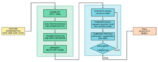 Flowchart of the data inversion processing workflow. The diagram details the novel procedures for both single-objective and joint inversion approaches, incorporating GCR and CCR data to enhance subsurface characterization.