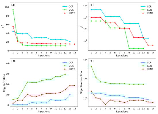 Trend comparison of the observed iterations during the inversion processes of GCR, CCR, and the joint method. (a) χ2 progression calculated as the ratio of data misfit to the number of observations; a better fit for GCR, a slower rate of decrease for CCR, and an effective balance for joint inversion can be observed. (b) parameter: these trends demonstrate that joint inversion effectively reduces the regularization weight, aligning with the theoretical expectation of approaching zero. (c) Regularization parameter; a better fit for GCR, a slower rate of decrease for CCR, and an effective balance for joint inversion can be observed. (d) Objective function combining the data misfit and regularization terms, the joint inversion achieves the lowest objective function value, demonstrating an improved model fit, and the ability of the joint inversion to balance model complexity with data fidelity.