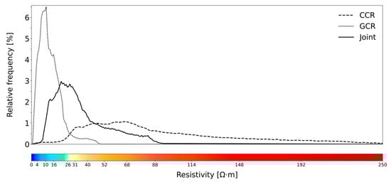 Resistivity value distribution for GCR, CCR, and joint inversion. The curves display different peaks: GCR is concentrated at lower resistivity values and CCR at higher values, while the joint inversion shows a wider distribution. The color scale also used in the following images aligns with the distribution patterns, is also included to visualize the resistivity range.
