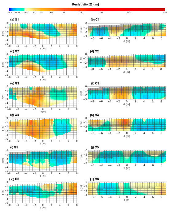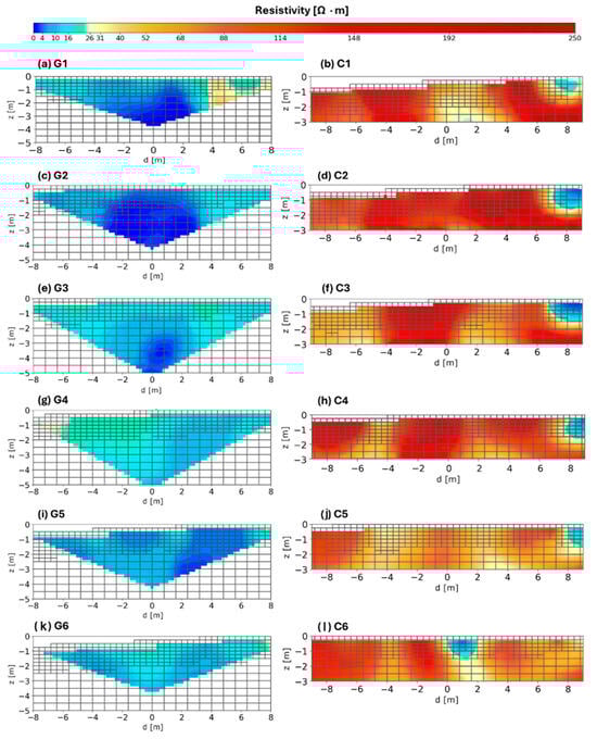Resistivity sections from GCR and CCR inversions. Panels (a,c,e,g,i,k) display six resistivity sections (identified by the letter “G”) derived from GCR inversion, corresponding to acquisition spreads oriented perpendicular to those used in the CCR inversion. Panels (b,d,f,h,j,l) show the resistivity (identified by the letter “C”) sections from CCR inversion, each aligned with its respective acquisition spreads. For the spatial location of the sections, refer to Figure 1.