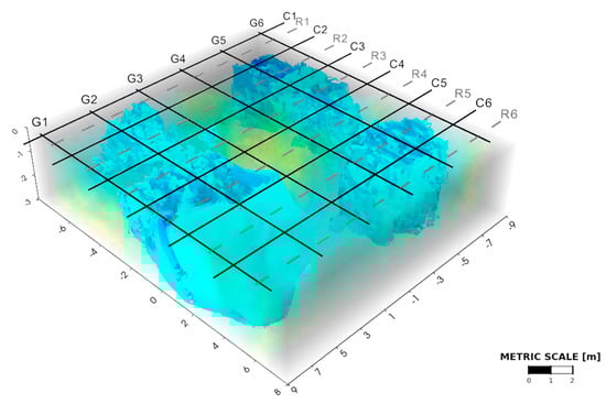 Three-dimensional resistivity model derived from the joint inversion. The 3D visualization highlights subsurface volume with resistivity values <20 Ω·m, providing a comprehensive view of the spatial resistivity distribution across the surveyed area. Location of GCR, CCR, and plant rows are identified, respectively, by the letters G, C, and R.