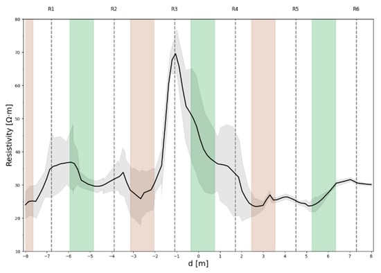 Average resistivity values of the joint inversion model (black line) within the first meter of depth at the virtual profile located between the G3 and G4 line. The gray band corresponds to the 1 standard deviation uncertainty range, the brown and green band highlight, respectively, the alternation between plowed and unplowed inter-row areas. The locations of the vine plants rows are indicated by the letter R.