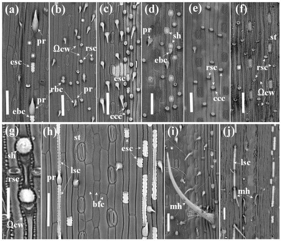 Main micromorphological elements of abaxial (a–f) and adaxial (g–j) leaf surface. (a) Apically directed prickles (B1) and oval or rectangular short cells with horizontally elongated silica bodies with sinuous outline (B7) in costal zone (N16); (b) basally directed prickles (B2), single and with basal round silica cell in costal zone. Rounded short silica cells with enfolding thin sickle-shaped or crescentic cork cells (B6), Ω-shaped anticlinal cell walls of costal long cells (N4); (c) basally directed prickles (B2) and oval silica cells (B7), almost round with white longitudinal stripe in midvein zone (N4); (d) single or with elongate basal cell shield-shaped prickles (B4) in costal zone (w107); (e) round silica cells (B6) with enfolding crescentic cork cells in costal and intercostal zones (N23); (f) round silica cells (B6) alternating with intercostal long cell with well-defined Ω-shaped (B8) anticlinal cell walls (f11814); (g) shield-shaped prickles (D2) and round silica cell (D3) paired with round basal cell (f11814); (h) oval or rectangular short cells with horizontally elongated silica bodies with sinuous outline (D3) in costal zone and bulliform cells in intercostal zone on the adaxial leaf side (w107); (i) macro-hair in costal zone and small hairs or prickles (hooks) near stomata (f11814); (j) basally directed macro-hairs in costal and intercostal zones, bulliform cells in the intercostal zone between stomatal rows (w107). Scale bar 100 µm (a–f, h–j), 50 µm; (g) direction to leaf tip from bottom to top. bfc—bulliform cell; ccc—crescentic cork cell, enfolding the silica cell; cz—costal zone; ebc—elongated basal cell; esc—elongated or elliptical silica cell; iz—intercostal zone; lsc—long silica cell; mh—macro-hair; mvz—midvein zone; pr—prickle; rbc—round basal cell; rsc—round silica cell; sh—shield-shaped prickle; st—stomata; Ωcw—Ω-shaped anticlinal cell walls.