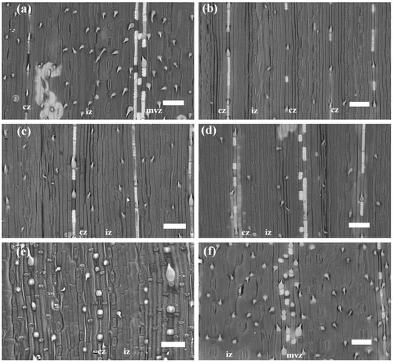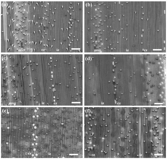 Adaxial leaf surface of hybrids and parents. (a) N4: midvein and costal zones with apically directed prickles and oval or rectangular short cells with horizontally elongated silica bodies with sinuous outline, basal cells of prickle are elongated or long; (b) (N14), (c) (N16), and (d) (N23): costal zone with apically directed prickles and oval or rectangular short cells with horizontally elongated silica bodies with sinuous outline, basal cells of prickle are oval or rectangular; (e) f11814 (mother): apically directed prickles and shield-shaped prickles in costal zone, round basal cells in prickles of both types; (f) w107 (father): midvein and costal zones with apically directed prickles and oval or rectangular short cells with horizontally elongated silica bodies with sinuous outline, basal cells of prickle are oval or rectangular, similar to hybrids. Scale bar 100 µm. Direction to leaf tip from bottom to top.
