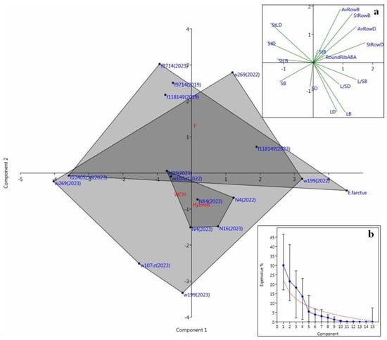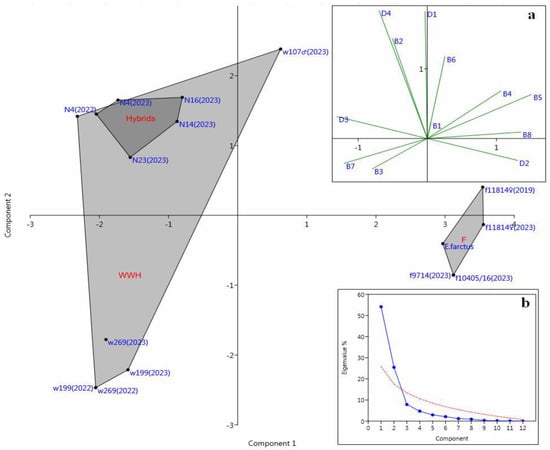 Scatter plot of samples in coordinates of the first and second principal components. Principal component analysis (PCA) was used to analyze the presence and degree of expression of 8 micromorphological markers on the abaxial side of the leaf and 4 markers on the adaxial side of the leaf. In the insets: (a) “Biplot” projection of the original variables onto the scattergram; (b) plot of eigenvalues. The eigenvalues expected under a random model (broken stick) are indicated by the red dashed line (plot of actual versus randomly generated eigenvalues). The dots represent the examined samples in 3 groups. Hybrids—hybrid samples obtained by crossing f11814 × w107; WWH—wheat-wheatgrass hybrids of wheat type, including paternal plants of w107; F—f-hybrids, progeny of crossing ×Trititrigia cziczinii Tsvel. with Elymus farctus, including mother plants f11814 and E. farctus specimens.