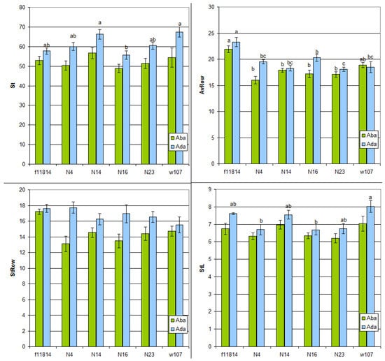 Plants from samples N16, 23, and 4 were medium-grown, close in height to the paternal form w107, and of the standard wheat variety Sudarynya for the Moscow region (Table A1, Figure A1). Sample N14 is tall, similar in height to the parental form f11814, and of the standard wheat variety Zlata used by us. The spike is mostly spindle-shaped. Plants of the maternal line f11814 had a higher number of spikelets per spike, flowers per spikelet, and total grains per spike, but the grains were smaller in size compared to w107 (Table 1). N14 was closer to f11814 in both the number of spikelets and height, while N23 was comparable to w107. The performance of hybrid plants was intermediate. Compared with the standard variety Sudarynya, the hybrid accessions were similar to it in spike length, number of spikelets in the spike, but had slightly lower values for the number of flowers in the spikelet and grains in the spike. Thus, hybrids generally occupy an intermediate position between the maternal and paternal forms in terms of plant height, spike length, and the number of spikelets in the spike.