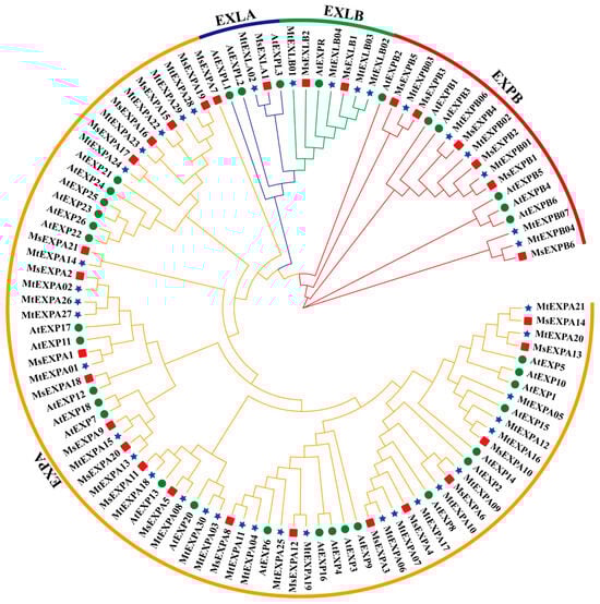 Phylogenetic relationships of expansin proteins. The expansin proteins from alfalfa, M. trunctula and Arabidopsis were used to construct an unrooted phylogenetic tree by MEGA 7.0 software. Clades in orange, red, blue and green branches indicate EXPA, EXPB, EXLA and EXLB subfamilies, respectively. The red squares, blue stars and green dots represent expansins from alfalfa, M. truncatula and Arabidopsis, respectively.