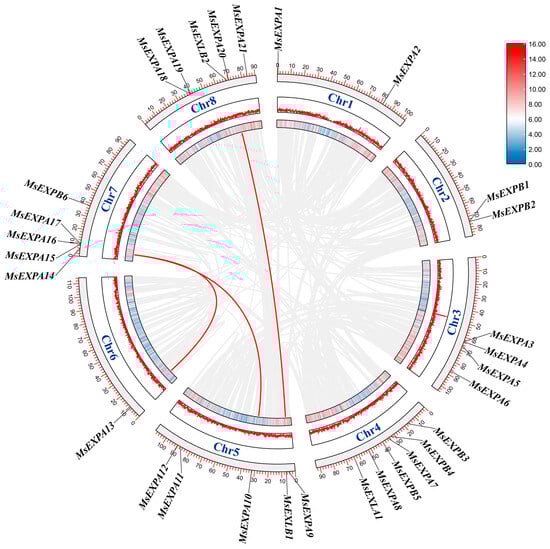 Distribution and collinearity analysis of MsEXPs. Synteny between the two genomes is represented by red lines.