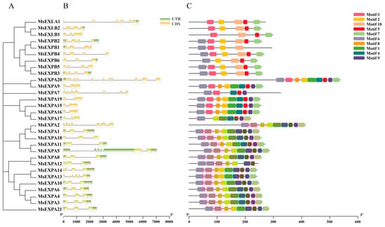 The structures (exon–intron organization) of MsEXP genes were analyzed by alignment of the genomic DNA sequences with corresponding cDNA sequences. The exon numbers of the MsEXP genes varied from 2 to 11, and most of the MsEXP genes had 3 exons. To determine whether the gene structure is consistent with the phylogenetic classification, the other unrooted phylogenetic tree was constructed (Figure 3). As was expected, the closely related EXP genes have similar gene structures (Figure 3B). For instance, homologous pairs, such as MsEXPB1 and MsEXPB2, MsEXPA3 and MsEXPA6, MsEXPA7 and MsEXPA20, share similar exon–intron patterns. Additionally, the motif compositions of MsEXP proteins were studied by the online program MEME, and 10 motifs were identified in these MsEXP proteins (Figure 3C). MsEXP proteins in the same subfamily had similar motif composition, while high divergence appears among different subfamilies, suggesting that MsEXP proteins in different subfamilies perform different functions (Figure 3C). For example, MsEXPA members had nine conserved motifs, while MsEXPB proteins shared six conserved motifs. Motif 2 and motif 3 were annotated as conserved DPBB domains, and motif 4, motif 5 and motif 10 were annotated as CBM domains. To summarize, the above results suggest that the gene structures of MsEXP genes and the motif composition of MsEXP proteins were in accordance with the phylogenetic relationship of MsEXPs.