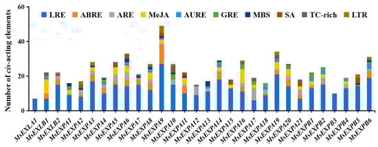 Analysis of the cis-acting elements in promoters of MsEXP genes. LRE: light responsive element; ABRE: abscisic acid responsiveness; ARE: regulatory essential for the anaerobic induction; MeJA: MeJA responsiveness; AURE: auxin-responsive element; GRE: gibberellin-responsive element; MBS: MYB binding site involved in drought inducibility; SA: salicylic acid responsiveness; TC rich: defense and stress responsiveness; LTR: low-temperature responsiveness.