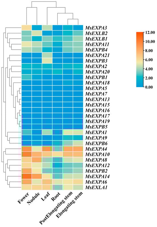The expression profiles of expansins genes in different tissues of alfalfa plants. The expression values of MsEXP genes in six tissues (flowers, nodules, leaves, roots, post elongating stems and elongating stems) were used to generate the heatmap with the TBtools software.