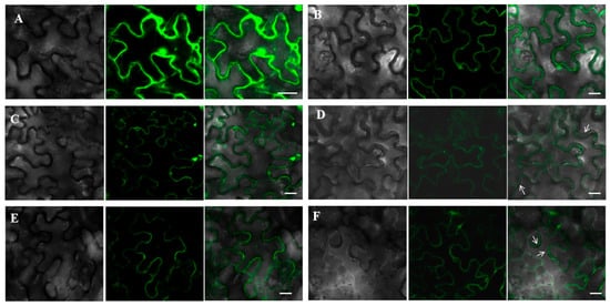 To further explore MsEXP genes that are involved in the leaf and stem development of alfalfa, MsEXPA3 and MsEXPA4 were chosen as candidate genes, which were preferentially expressed in leaves and stems. Firstly, subcellular localization analysis of MsEXPA3 and MsEXPA4 proteins was conducted. An enhanced green fluorescence protein (GFP) was in-frame fused with a linker to their C-terminal and transiently expressed in leaves of tobacco. Observation of leaf epidermal cells revealed that the fluorescence of both MsEXPA3-GFP and MsEXPA4-GFP fusion proteins was localized in the contours of cells (Figure 6C,E). After plasmolysis, the green fluorescence signal of both the MsEXPA3 and MsEXPA4 protein was present in the cell wall (Figure 6D,F). However, 35S::GFP expressed epidermal cells showed fluorescence signal throughout the cells before and after plasmolysis (Figure 6A,B). The above data demonstrate that both MsEXPA3 and MsEXPA4 were localized in the cell wall, which is consistent with the subcellular localization predicted by PSORT.