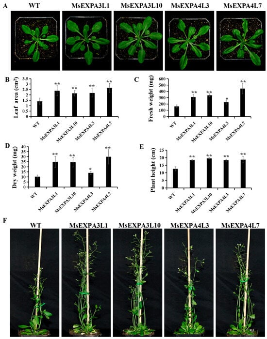 Morphological phenotypic analysis of MsEXPA3 and MsEXPA4 transgenic Arabidopsis plants. (A) The aboveground parts of Arabidopsis plants 28 DAG (days after germination). (B) Measurement and statistical analysis of leaf areas of Arabidopsis plants 28 DAG. The first four rosette leaves in (A) were measured. (C,D) Measurement and statistical analysis of fresh weight (C) and dry weight (D) of Arabidopsis plants 28 DAG. (E) Measurement and statistical analysis of height of Arabidopsis plants 42 DAG. (F) The aboveground parts of Arabidopsis plants 42 DAG. WT, wild type; MsEXPA3L1 and MsEXPA3L10, MsEXPA3 overexpression transgenic lines; MsEXPA4L3 and MsEXPA4L7, MsEXPA4 overexpression transgenic lines. One or two asterisks represent significant (* p < 0.05) or very significant (** p < 0.01) differences between wild-type and transgenic lines.