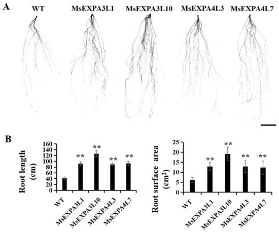 To further investigate if MsEXP is also related to the growth of underground parts, the morphological phenotypes of roots in MsEXPA3 and MsEXPA4 overexpression plants were examined, using the wild type as controls. The roots of MsEXPA3 and MsEXPA4 overexpression transgenic lines and WT plants 21 DAG were washed clean and scanned under a root scanner. As shown in Figure 8A, the root system of MsEXPA3 and MsEXPA4 overexpressed plants was more developed than that of WT. Further statistical analysis suggested that not only the total root length of MsEXP transgenic lines was longer than that of the wild type but also the root surface area of MsEXP transgenic lines was much larger than that of the wild type (Figure 8B). These data reveal that overexpression of MsEXPs could promote root growth.