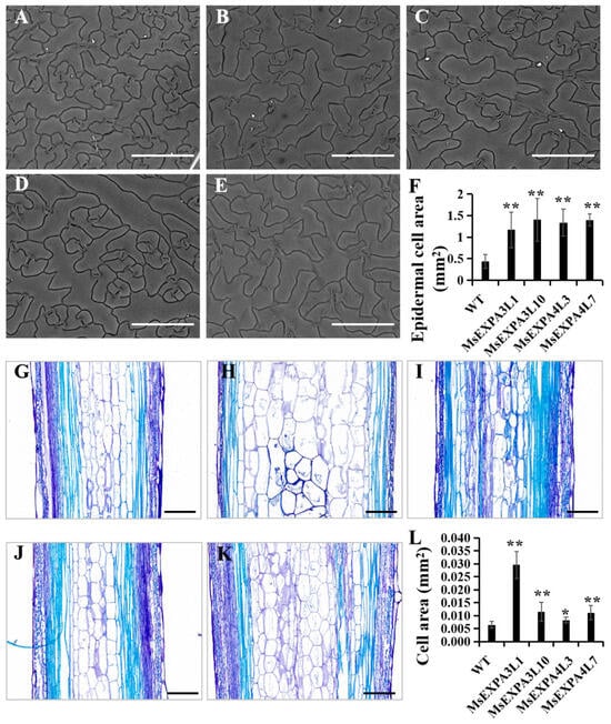 MsEXPA3 and MsEXPA4 affect cell expansion. (A–E) Images of epidermal cells in leaves of WT lines (A), MsEXPA3 overexpression lines (B,C) and MsEXPA4 overexpression lines (D,E). Bars = 150 µm. (F) Measurement and statistical analysis of cell areas of leaves in MsEXPA3 overexpression plants, MsEXPA4 overexpression plants and wild-type lines (n ≥ 30). (G–K) Longitudinal sections stained with toluidine blue o of stems in WT lines (G), MsEXPA3 overexpression lines (H,I) and MsEXPA4 overexpression lines (J,K). Bar = 200 µm. (L) Measurement and statistical analysis of cell areas of stems in MsEXPA3 overexpression plants, MsEXPA4 overexpression plants and wild type (n ≥ 30). WT, wild type; MsEXPA3L1 and MsEXPA3L10, MsEXPA3 overexpression transgenic lines; MsEXPA4L3 and MsEXPA4L7, MsEXPA4 overexpression transgenic lines. One or two asterisks represent significant (* p < 0.05) or very significant (** p < 0.01) differences between wild-type and transgenic lines.