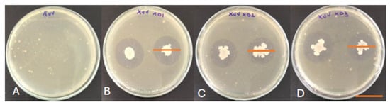 Agar diffusion test (pour plate) with cell suspensions of LAFUEL 01, LAFUEL 02, and LAFUEL 03 putative antagonist bacterial strains against RL1 Xanthomonas vasicola pv. vasculorum—Xvv. The orange line indicates the diameter of the growth inhibition zone of RL1Xvv. (A), control; (B), LAFUEL 01; (C), LAFUEL 02; and (D), LAFUEL 03. Bar = 30 mm. Plates shown are representative of eight replicates of each treatment.