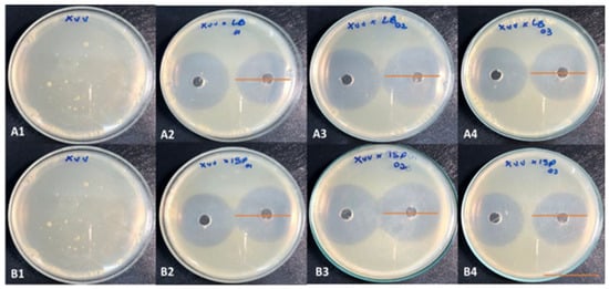 Agar well diffusion tests (pour plate) of cell-free supernatant of LAFUEL 01, LAFUEL 02, and LAFUEL 03 putative antagonist bacterial strains produced in LB (A) and ISP2 (B) media against RL1 Xanthomonas vasicola pv. vasculorum—Xvv. (A1,B1), control; (A2,B2), LAFUEL 01 CFS; (A3,B3), LAFUEL 02 CFS; (A4,B4), LAFUEL 03 CFS. The orange bar indicates the diameter of the growth inhibition zones of the RL1 Xvv by the cell-free supernatant of the putative antagonist bacterial strains. Bar = 40 mm. The plates shown are representative of the eight replicates of each treatment.