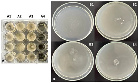 In the test with the CFSs of LAFUEL 01, LAFUEL 02, and LAFUEL 03, there was no effect on either the culture media or the putative antagonist bacterial strains. Furthermore, there was no significant interaction between the factors, culture medium, and putative antagonist bacterial strain in the two experiments (Table 2). For the CFSs of the bacterial strains grown in the LB medium, the diameter of the inhibition zones was 39, 40, and 38 mm, respectively (Figure 2A1–A4). Further, the diameter of the inhibition zones for the LAFUEL 01, LAFUEL 02, and LAFUEL 03 CFSs produced in the ISP2 medium were 37, 39, and 38 mm, respectively (Figure 2B1–B4).