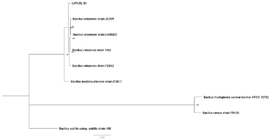 When compared to the type strain DSM7(T) of B. amyloliquefaciens, an average nucleotide identity (ANI) of 93.99% was observed, suggesting that the LAFUEL 03 strain and DSM7(T) are distinct species. This classification is significant for this bacterial group due to the inconsistent delimitation that has occurred over the years [63,64,65]. A lower similarity of LAFUEL 03 was shown with B. subtilis subsp. subtilis type strain 168, 76.91%. Based on the comparisons using RaxML, LAFUEL 03 was placed within a cluster that included most of the B. velezensis strains (Figure 4).