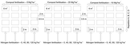 | Year | Nitrogen Fertilisation (kg·ha−1) | Compost Fertilisation (Mg·ha−1) | Average Calorific Value (MJ·kg−1 DM) | ||