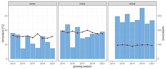 Winter wheat, spring barley, and maize were selected for this study to analyze different seasonal crops. The temperature and precipitation during the growing season (sowing until maturity/harvest) for each investigated year are summarized in Figure 1. For spring barley, the period runs from March to June, for maize, it runs from April to October, and for winter wheat, it runs from October to July.