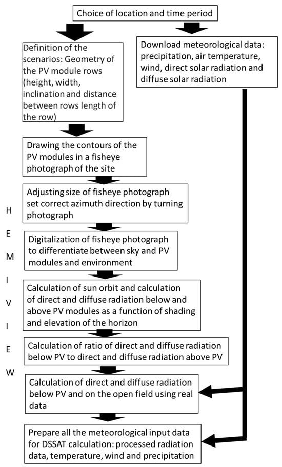 Overview of the calculation process for determining the influence of PV on incident solar radiation and the preparation of the meteorological input data for the DSSAT simulations.