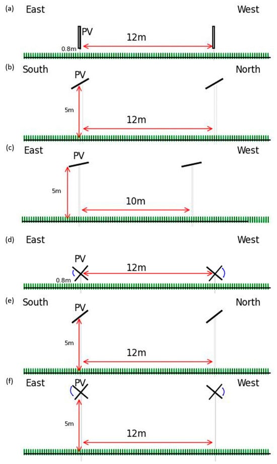 (a–f). The V01–V07 scenarios. PV: PV modules. The height above the ground and the distance between the rows are indicated. Please note that (b) describes scenarios V02 and V05, which only differ in the length of their rows (V02 11.98 m and V05 147.7 m, respectively). (a) In scenario V01, the PV modules are assumed to be in the vertical position with a lowest height above the ground of 0.8. (b) Scenarios V02 and V05 have different row lengths. The PV modules are at a 5 m height with 30-degree inclination, facing south. (c) Scenario V03 has PV modules with 12-degree inclination at a 5 m height and facing east. (d) Scenario V04 has a tracker mounted at a 1.3 m height with a minimum height between the PV modules and ground of 0.8 m. The PV modules are aligned north–south, so they are facing the eastern or western direction and their inclination changes within ±50 degrees. (e) The V06 scenario is similar to V05 but with a module inclination of 38 degrees. (f) V07 is similar to V04, but the PV modules are at a 5 m height. Blue lines show in which direction the PV module can move. Black lines show the PV modules.