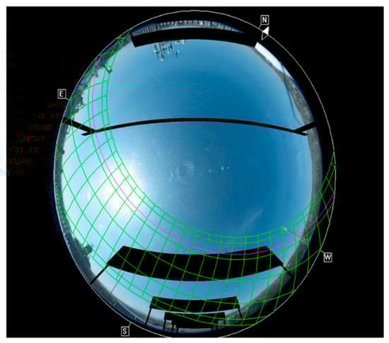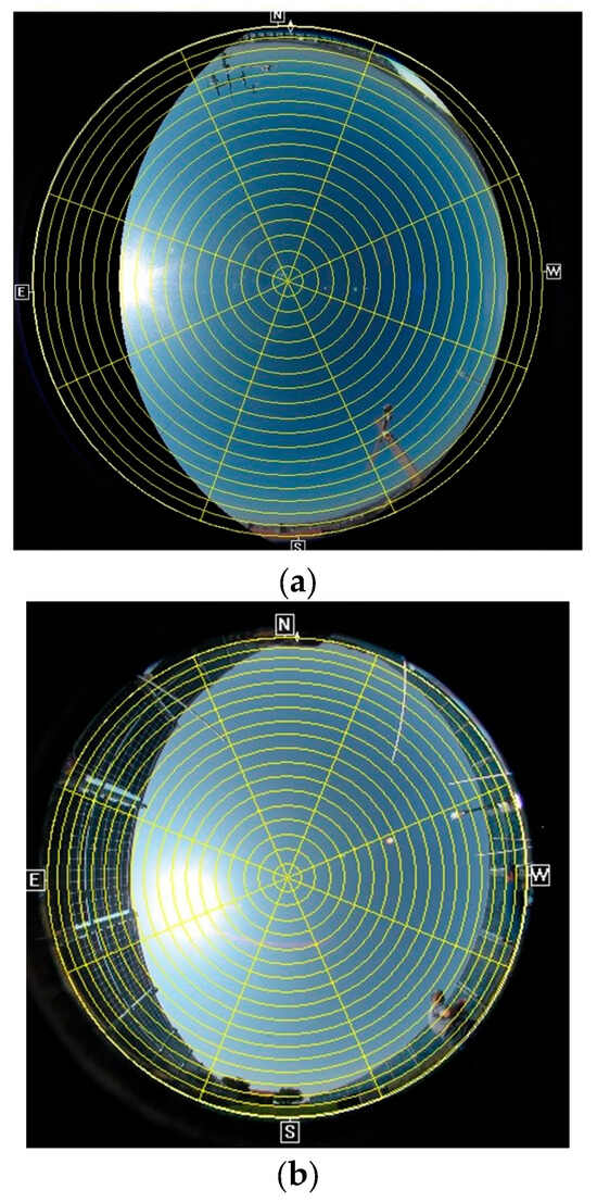Comparison of (a) edited fisheye photograph and (b) real fisheye photograph taken in Raasdorf. (b) The fisheye photograph was taken at a distance of 3 m west of the PV modules. The background fisheye photograph of the edited photograph was taken from a cloud-monitoring camera situated in BOKU, Vienna, on April 5th. However, the information in the background photograph was not used during the subsequent digitization with the HemiView software. A grid with the zenith and azimuth angles was placed on the images to ensure comparability.