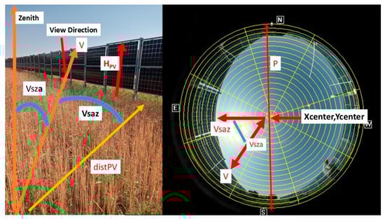 where Vsza is the zenith angle of the sight direction; HPV is the height of the PV modules; and distPV is the distance of the PV modules.