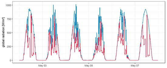Calculated hourly global radiation data for scenario V02 for the period 2–7 May 2020. The blue line displays the original global radiation data of the ARAD network for Vienna, and the red line depicts the incident solar radiation below the APV modules for scenario V02.