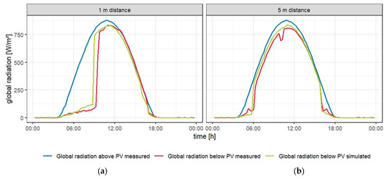 Figure 8 and Figure 9 show the comparison of the simulated and measured radiation below the APV in Raasdorf on a perfect clear-sky day. The PAR was multiplied by a factor of 0.5, following Tsubo and Walker [28]. However, one has to bear in mind that the conversion factor from PAR to global radiation changes as a function of the spectral distribution of the solar spectrum and may fluctuate between 0.43 and 0.5. Figure 8a depicts the diurnal cycle of the global radiation above and below the APV on 27 April 2024. The calculation and measurement point is situated 1 m west of the panels, and the shadows cast in the morning until 9 a.m. are visible. Figure 8b shows the same values as those in Figure 8a but at a distance of 5 m west of the panels.