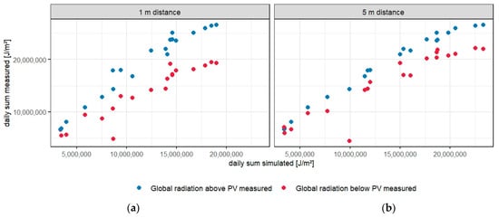 Comparison of simulated and measured daily sums of radiation from 17 April to 8 May 2024. (a) Radiation sums at a distance of 1 m west of the panels. (b) Radiation sums at a distance of 5 m west of the panels. The measured global radiation above the PV system is also displayed to visualize attenuation.
