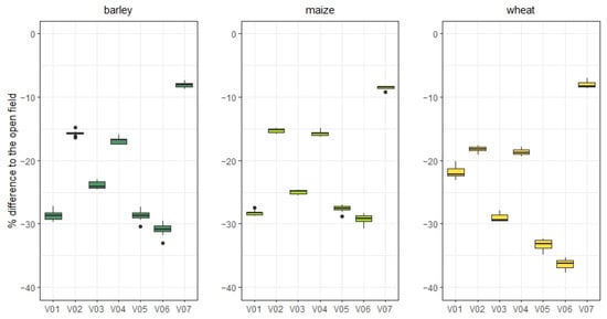 The reductions in the global radiation under the various APV designs for the different crop growing seasons are shown in Figure 12. With a reduction in global radiation of roughly −30% for spring barley and maize, it is evident that V01, V05, and V06 had the greatest impact. This finding is only recognizable in V05 and V06 for wheat (<−30% less global radiation) due to the extended winter wheat period. V07, which shows a reduction of less than 10%, had the least impact for the three crops. The reduction in V02 and V03 is between 15 and 20% for all three crops and is, therefore, in the middle of the range.