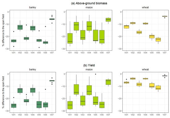 Among the individual APV design variants and crops, there are clear simulated differences in the shading effects on the crop biomasses and yields (Figure 13). The high variability in the maize, which is not as pronounced in the other two crops, is because maize (C4 plant) requires more radiation. Hence, the mean standard deviations (SDs) over all the variants are −8.8% for maize biomass and −14.8% for the yields. Spring barley, with SDs of −7.4% for biomass and −7.8% for yield, and winter wheat, with SDs of −6.4% for biomass and −3.5% for yield, are significantly lower. The greatest biomass and yield reductions are registered for maize and spring barley in V01, V03, V05, and V06 (biomasses and yields less than −20%), while V02 and V04 show reductions of approximately 12−15%. Winter wheat presents a different behavior. The biomass in V01–V04 is reduced by approximately 8–17%, and the grain yield is reduced by between 4 and 8%. With over 20% less biomass and over 10% less yield, V05 and V06 have the greatest yield loss effects on winter wheat.