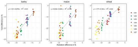 The correlation between the relative differences in the yields and the global radiation was examined in more detail using a regression equation (Figure 14). The relative yield reduction (%) relative to the open field (winter wheat: r2 = 0.83; spring barley: r2 = 0.82; and maize: not significant) increased with the amount of radiation reduction (%). Because maize reacted more strongly to absolute radiation reduction not only due to the APV design but also due to the weather, there is a greater spread of the simulated annual yields in each variant, and, therefore, no significant correlation to the relative radiation reduction.
