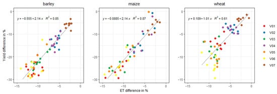 If the simulated evapotranspiration with the DSSAT is also considered, the following can be determined: the higher the relative yield difference (%) to that of the open field, the higher the relative differences in the simulated evapotranspiration (%) to that of the open field (maize: r2 = 0.81; spring barley: r2 = 0.86; and winter wheat: r2 = 0.61) (Figure 15).