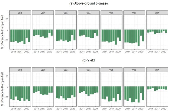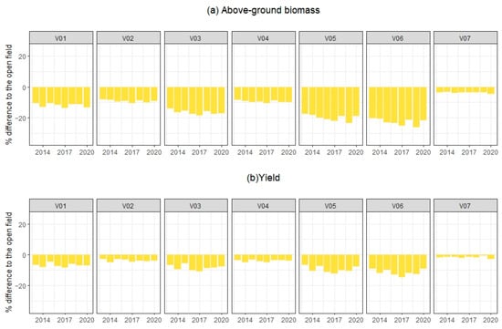V01, V03, V05, and V06 displayed the greatest reductions in the biomass and yield for maize (Figure 17). During the drier growing seasons (2015 and 2017) (Figure 1), these decreases were the lowest and, in some cases, even showed higher biomasses and/or yields than in the open field. In 2015, a higher above-ground biomass for maize (around +8%) was simulated under the APVs in V02, V04, and V07, as well as higher yields (>10%) in V01, V03, V05, V06, and V07. With a total of 124 mm during the maize vegetation period, this was the driest year on record; with 224 mm, 2017 had the second driest growing season. In the wetter years (especially 2013, 2014, and 2016, with more than 315 mm of precipitation during the growing season), the biomass and grain yield were significantly lower. V07 demonstrated the lowest biomass and yield reductions in almost all years for maize.
