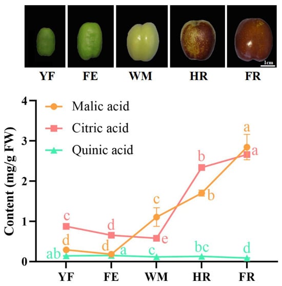 Determination of organic acid components during fruit development. YF, young fruit stage, 20 DAF; FE, fruit expanded stage, 40 DAF; WM, white mature stage, 60 DAF; HR, half-ripe stage, 100 DAF; FR, fully ripe stage, 120 DAF. The same lowercase letter means that there is no significant difference between different stages of the same component.