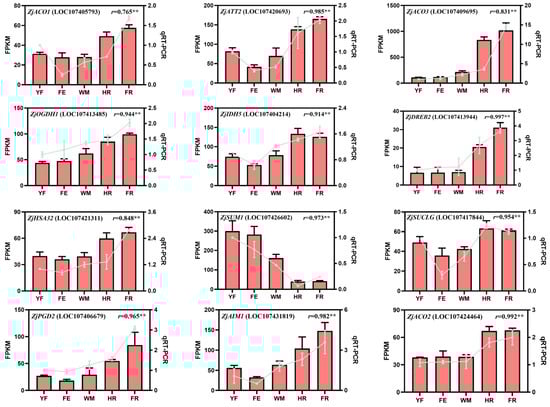 To verify the accuracy of RNA-seq results, twelve key candidate genes were randomly selected for qRT-PCR analysis. The qRT-PCR data and transcriptome data of these genes showed an extremely significant positive correlation (Figure 3), with an average correlation coefficient of 0.929, indicating the reliability of the transcriptome data. Additionally, aconitase1 (ZjACO1), aconitase3 (ZjACO3), and heat stress-associated protein 32 (ZjHSA32) exhibited r values below 0.900, which may be attributed to factors such as primer efficiency, PCR amplification conditions, or the presence of homologous genes.