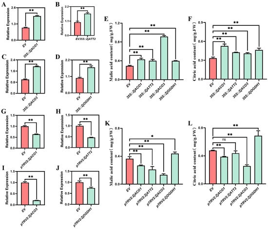 Transient overexpression and silence analysis. (A–D) qRT-PCR analysis of overexpression of ZjACO1, ZjATT2, ZjACO3, and ZjOGDH1; (E,F) malic acid content and citric acid content after overexpression of four key genes; (G–J) qRT-PCR analysis of silencing of ZjACO1, ZjATT2, ZjACO3, and ZjOGDH1; and (K,L) malic acid content and citric acid content after silencing of four key genes. * indicates p < 0.05, ** indicates p < 0.01, and ns indicates no significance.