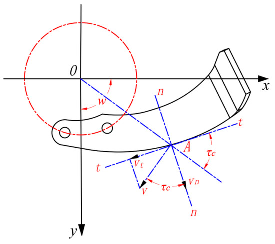 During operation, the rotary tiller’s blades revolve around the axis at an angular velocity w. Figure 1 illustrates that for any point A on the side cutting edge, the velocity at this point is v = rw, where r represents the distance from this point to the axis. A tangent t–t and a normal n–n intersect at point A. The speed v can be decomposed into two components: vn, perpendicular to the cutting edge, and vt, parallel to it. The ratio vt/vn = tgτc is referred to as the slip coefficient, with τc denoting the slip angle. The relationship between the slip angle and slip effect is crucial; an excessively small slip angle renders the slip effect negligible and ineffective, whereas an overly large slip angle increases the side cutting edge’s curvature, resulting in a larger overall tool size and associated issues such as increased power consumption. Considering these considerations, it is essential to conduct a computational analysis of the slip angle and its resulting effects.