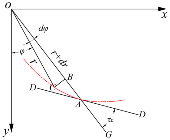 Figure 2 depicts the slip angle, typically defined as the angle between the radial line O–G at the cutting edge A and the tangent D–D. Let r = r(φ) be the polar coordinate equation for the cutting-edge curve. When φ increases by dφ, the change in the radial distance is dr. Therefore, AB = dr and BC = rdφ. The slip angle equation for the cutting edge can thus be expressed as follows: