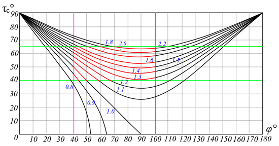 Drawing from design experiences with other blade types [18], the polar angle φ1 is limited to a range of 40° to 100°, while the cutting angle τc is confined between 40° and 65°, as specified by Formula (4). Figure 5 illustrates these constraints, with pink and green lines representing the ranges of the polar angle φ1 and the cutting angle τc, respectively. The red curve in this domain depicts cutting characteristics across various eccentricities. This parameter space defines the experimental factor levels. The evaluation criterion is based on cutting resistance under different parameters, and an orthogonal experimental approach is utilized to identify the optimal parameter combination.