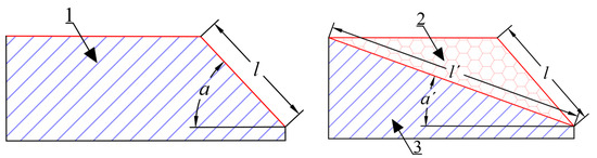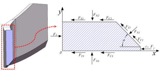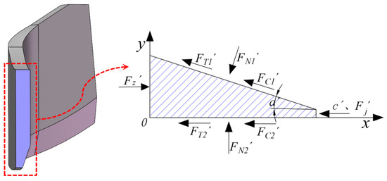 Assuming a consistent cutting-edge thickness, C and Fj are considered equivalent. An analysis of FZ and FZ′ in Equation (12) indicates that, considering a constant coefficient of kinetic friction μ, FTi exhibits a positive correlation with FNi. For a given unit load on the tool (i.e., uniform loading), the normal pressure is proportional to the bearing area. As depicted in Figure 7, the red-shaded area forms an obtuse triangle, with the original cutting-edge section represented by the two shorter sides and the new design’s cutting-edge section by the hypotenuse. The combined length of the two shorter sides surpasses that of the hypotenuse, resulting in a smaller cutting-edge section area for the new angle. Therefore, this leads to a reduced normal pressure, i.e., FZ′ < FZ.