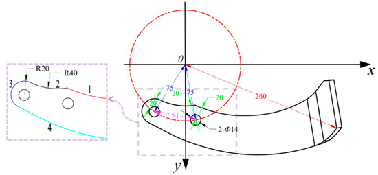 The operational environment for clearing blades is known to be relatively harsh; however, breakage is less severe compared to rotary blades. Accordingly, improvements were made to the clearing blade handle while maintaining the dual-bolt hole design. By incorporating the operational requirements of the rotary tiller, the handle was optimized to reduce weight and enhance structural integrity, offering improved breakage resistance while meeting working conditions. Figure 9 illustrates the enhanced handle design. With a rotational radius of 260 mm, the distance from the center of the two bolt holes to the rotation center is set at 75 mm, and the bolt hole spacing is established at 51 mm in accordance with national standards for clearing blades. The bolt holes have a diameter of 14 mm, utilizing M14 countersunk bolts to ensure compatibility with commonly available clearing blades and enhance tool versatility. Static analysis indicates that stress concentrates around the bolt holes during operation. To ensure uniform stress distribution between the bolt holes and the sidewall, the handle shape was adjusted to maintain a safety distance from the handle boundary to the center of the bolt holes, allowing for better stress relief. As indicated by the green dimensions, the shortest distance from the bolt hole center to the handle boundary is 20 mm. The exact positions of the two holes were determined by specifying the relevant dimensions.